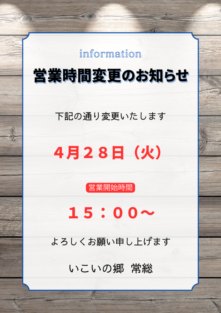 令和8年4月28日火曜日は営業時間を15:00〜とさせていただきます。